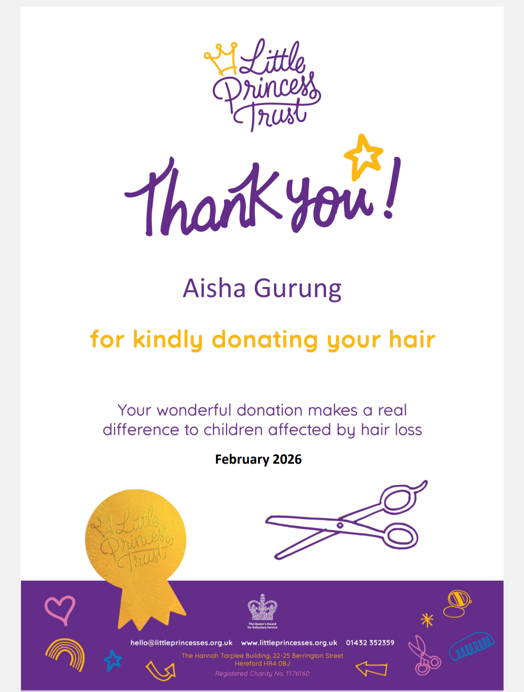 Well Done Aisha for donating 34 cm of your hair to The Little Princess Trust